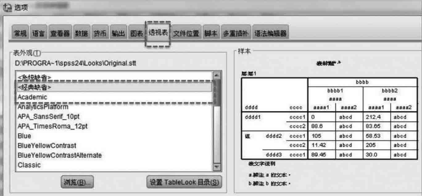 2)透视表:用于设置统计分析输出的统计表的格式,默认安装为经典缺省,但分析出来的结果与专业上的三线表相差较大,此处请改为Academic,此时分析出来的统计表与三线表非常接近。后面统计图表章节,松哥会讲授如何制作专业的统计表,或者直接关注微信公众号data973,回复“asongge”即可直接拿到松哥编写好的模板,直接复制到安装目录Looks文件夹内即可。