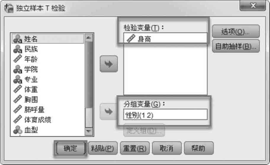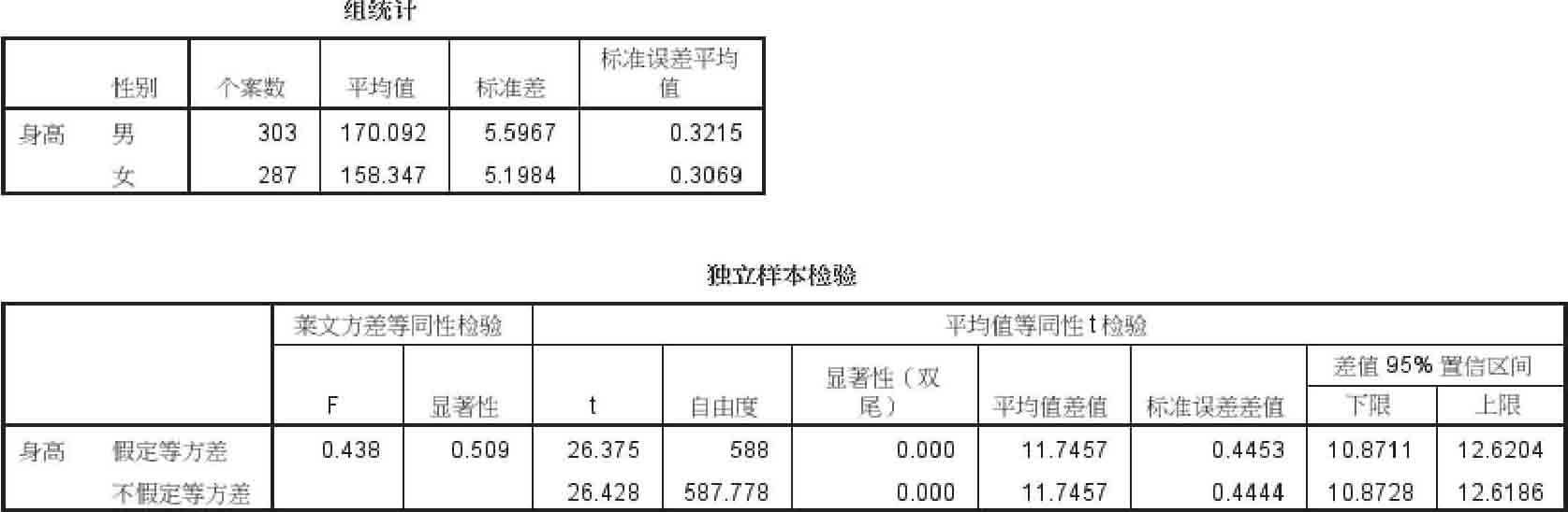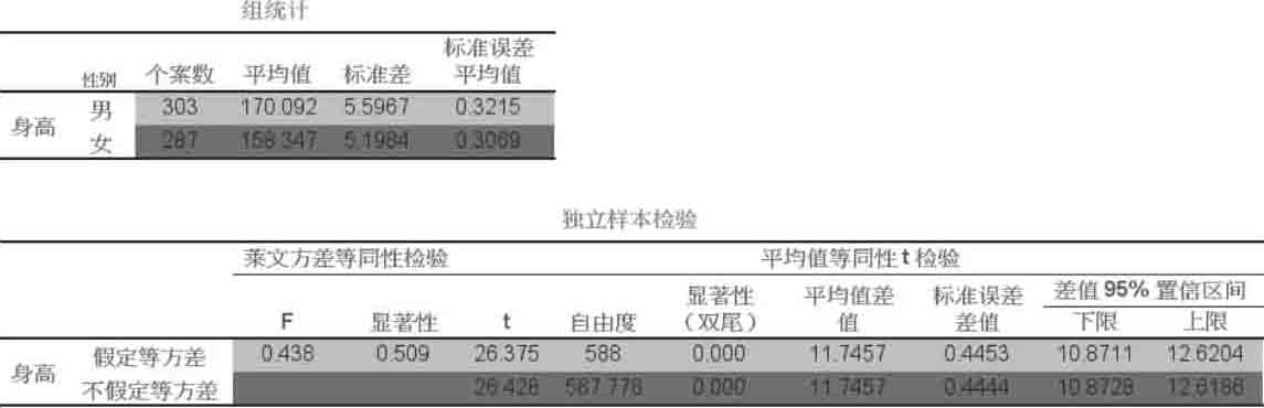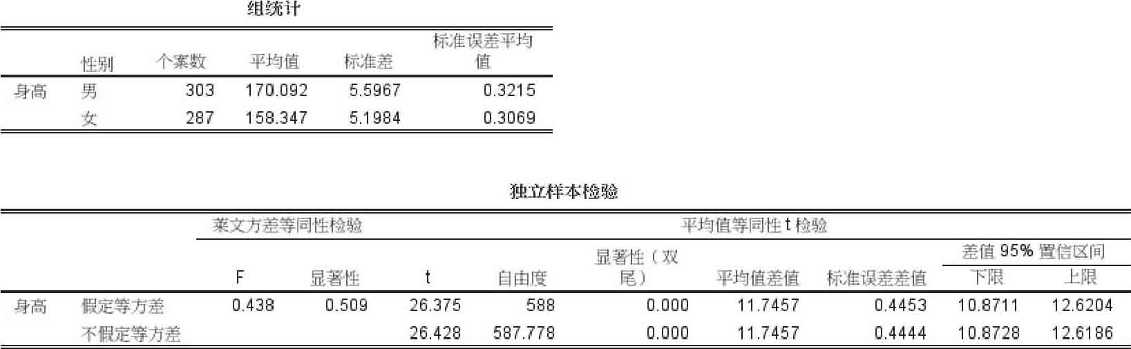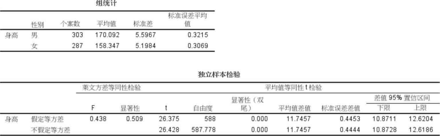 我们默认安装SPSS,进行统计分析,打开data01.sav数据库,点击菜单:分析—比较均值—独立样本 t 检验,按照图7-2设置,确定运行,看输出的表格。此处大家只要学着设置即可,该方法在后面会详细讲解。图7-3为分析结果的统计表展示,正规的统计表简称“三线表”,只有横线,没有竖线,可是默认的格式显然不符合。