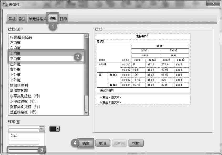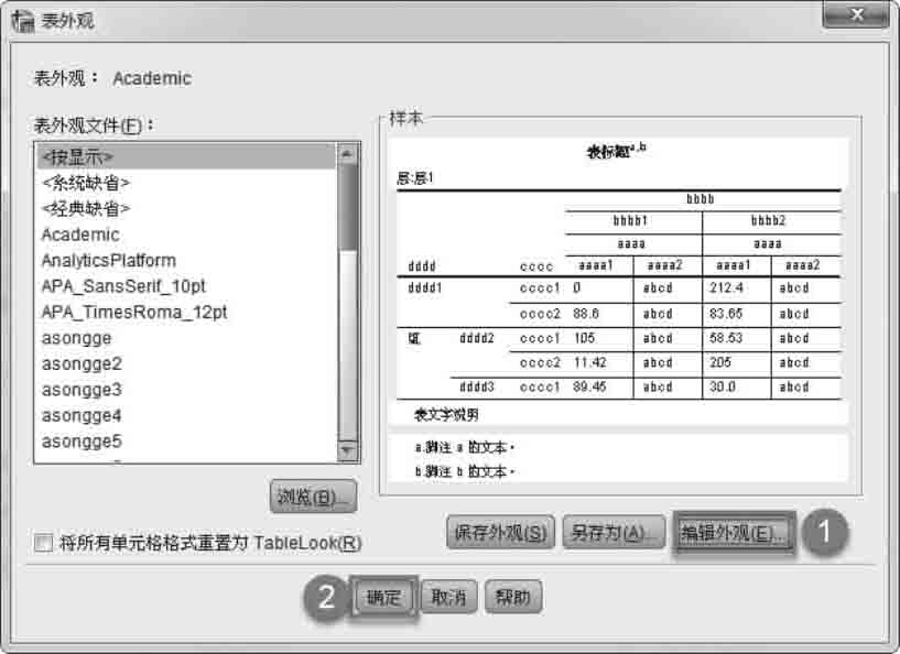 3. 操作步骤:双击结果输出窗口的统计表,右键—表外观(Tablelook),弹出窗口如图7-6所示。