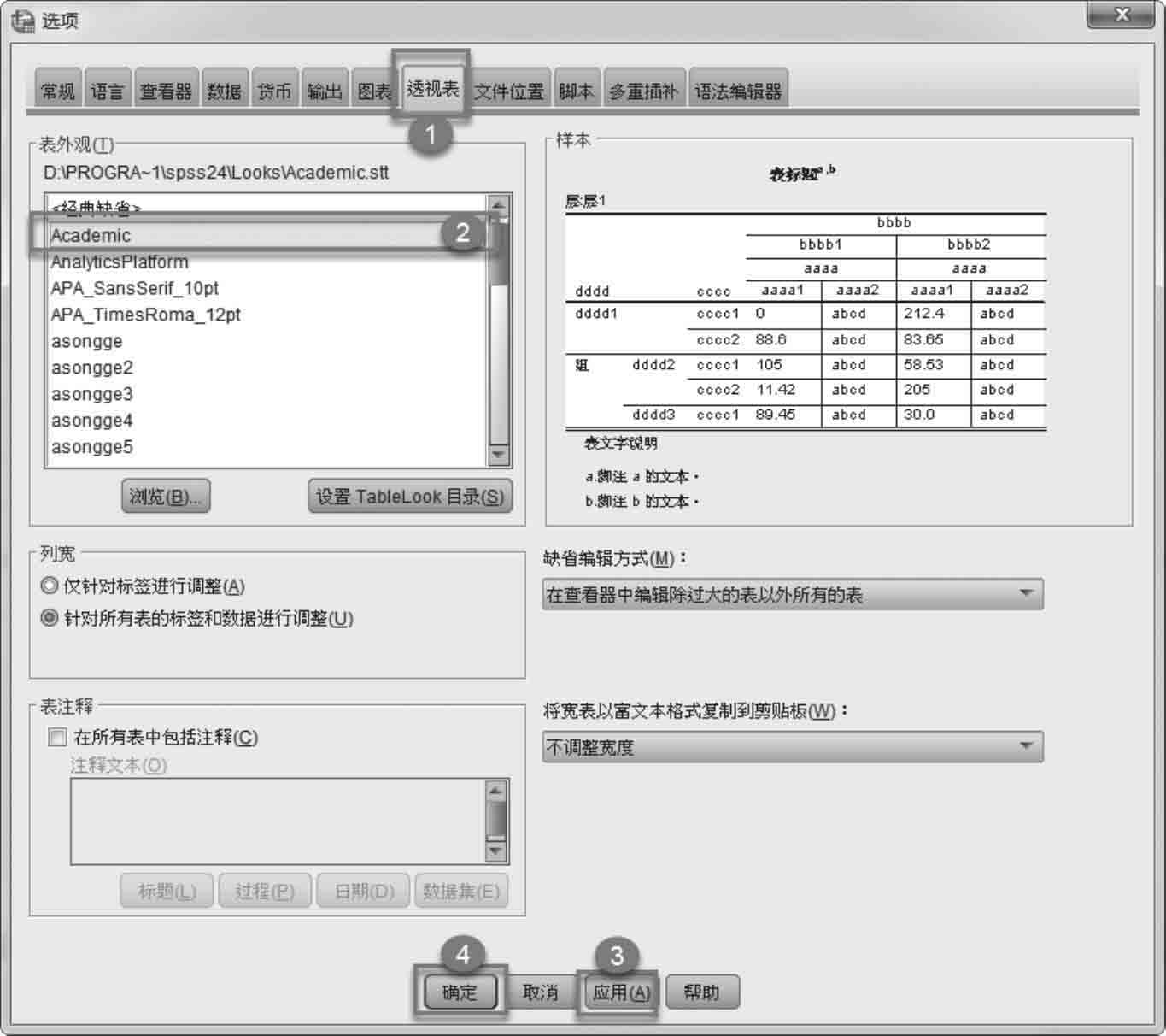 菜单操作:编辑—选项,弹出下图:透视表—Academic,右边即可展现近似三线表格式,如图7-4所示。