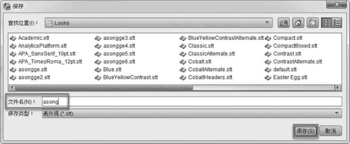 4. 此处重要:设置完毕,点击保存类型为“表外观”,起个名字“asong”,如图7-8所示,松哥起的以a开头方便大家能看到,请看左下图红框是否产生一个asong的格式。这就是我们自定义生成的格式啦!当然你可以定义一个你自己名字的格式,注意要以a开头,容易找到。