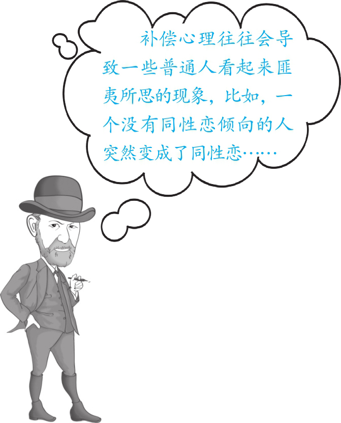 “‘补偿’乃是因为无法达成某种目的,而选择另外一种行为。(见图1-11)举个例子:一个清新浪漫的小男生梦寐以求一份完美、甜蜜的爱情,不幸的是他屡次被甩,梦想从未实现。万般无奈之下,男生决定,既然女人不能给我想要的东西,我干吗不找个男人呢?从此,又一个gay诞生了。当然,这个例子有点夸张,也是非常罕见的失恋疗法,通常情况下,人们会通过暴饮暴食、疯狂购物等来获得满足感和幸福感。