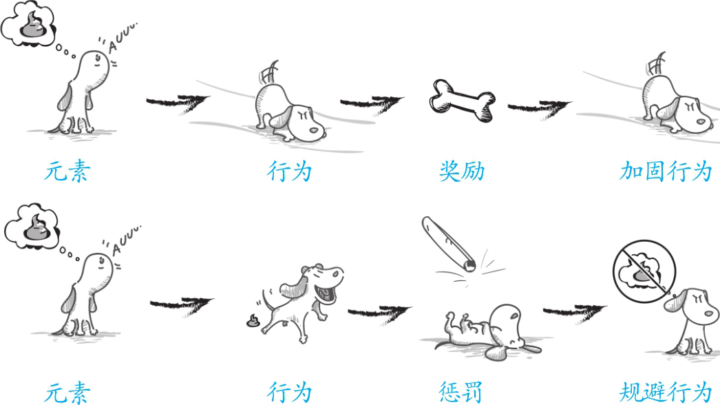 斯金纳老师:“就像每一个学生都知道好好学习可以得到奖励,而松懈、怠慢则会被老师家长批评一样,小白鼠或者其他的动物也可以通过反复的操作学习到自己的某一个举动会得到奖励,另外一个举动会遭到惩罚。养狗的人常常利用这一点去训练自己的宠物,如果狗在屋子里面上厕所,主人就会毫不留情地打骂它,时间一长,宠物就会明白自己在错误的地方排便是会得到惩罚的。我们训练自己的狗握手这个技能,如果狗做对了动作,就给它一点吃的,相反,做错了就不会有吃的。为了赢得吃的,狗就会按照我们的指示去学习握手。(见图3-2)