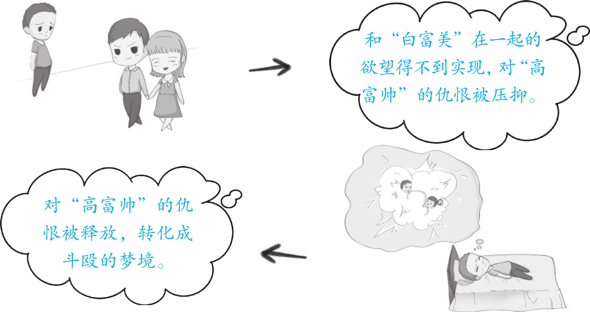 “咱还是用那个痴情的一脸青春痘的男生来举例。假设,这个男生被心爱的姑娘拒绝之后,某一天他正垂头丧气地走在街上,一抬头,突然看到心上人和一个高富帅手拉手并排走在街上,两个人有说有笑,脸上洋溢着幸福的表情。不用想,咱们的男主角肯定十分愤怒,恨不得冲上去把那个情敌胖揍一顿。可他转念一想,自己过去之后很可能揍人不成反被揍。唉,君子报仇十年不晚,先回家制订一个作战计划然后再来吧。于是他咬咬牙恨恨地离开了。当天晚上,他就极其有可能梦到自己把那个高富帅给美美地揍了一顿,而且还在脸上踹了两三脚,真是大快人心。这就是我们常说的‘日有所思,夜有所梦’。(见图1-2)