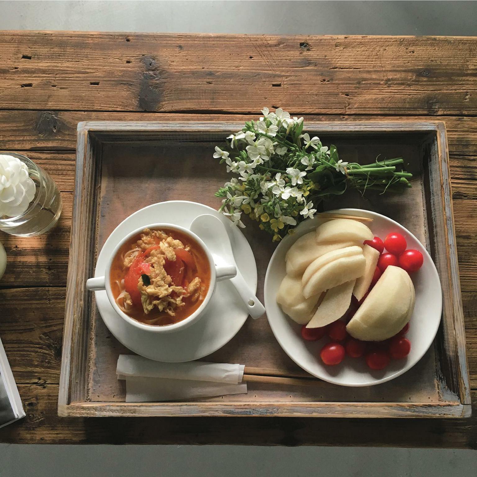 西红柿和鸡蛋,一红一黄,炒出来,覆盖在面条上,滋味互相渗透,用筷子搅拌的声音丰腴动听,挑一口到嘴里,在舌底咂摸西红柿被隐藏的酸味,不赖!一碗面条下肚之后,感觉还略有些欠缺,旁边这盘新鲜水嫩的水果,正好作为填补。小番茄鲜红发亮,圆滚滚的,一颗一颗放进嘴里,牙轻轻一咬,就有酸甜的汁水迸浆到舌尖。那几片梨子也是香脆爽口的,还没把它们都吃完,就感觉饱了。