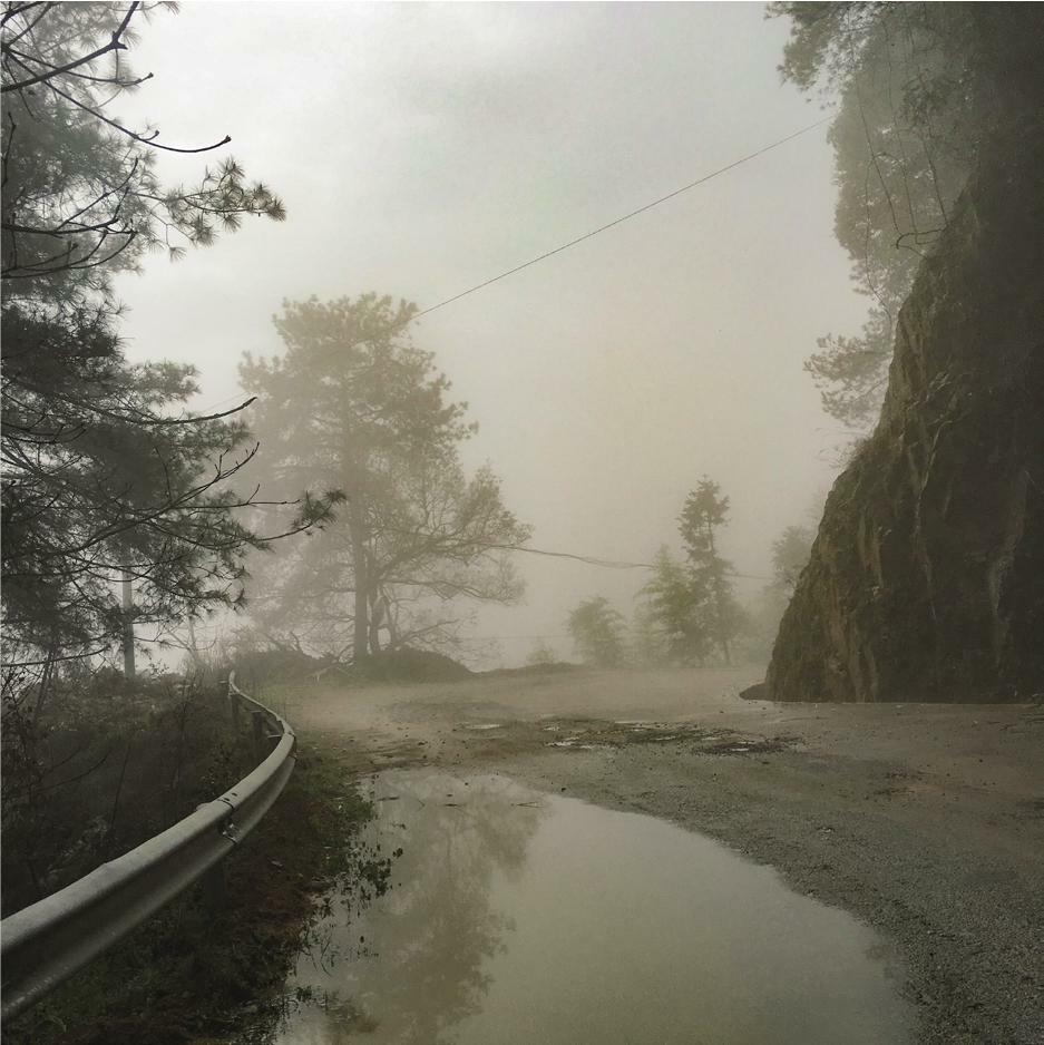 在山腰的公路上,并不知道这条路通向何方,这条路上没有一个人,山里的雾变得很快,不停地上升或下坠,飘远,又返回。这其实是个晴朗的天,所以,我一会儿走进阳光里,一会儿走进云里。