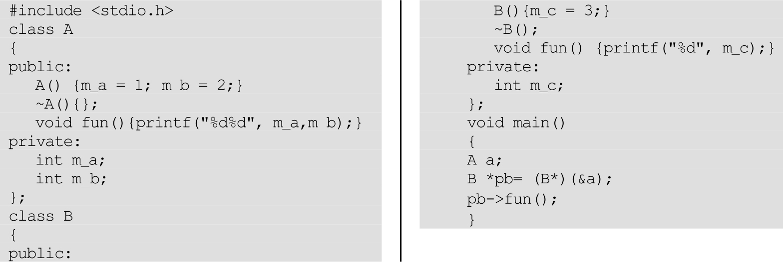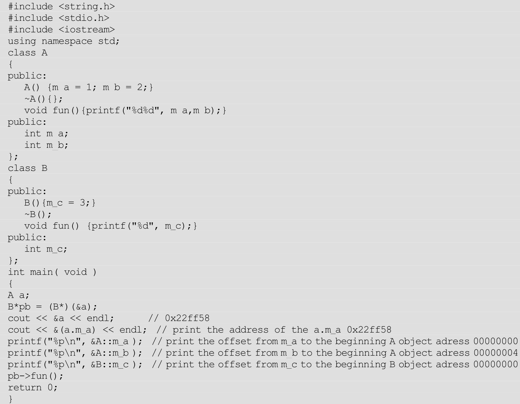 正常情况下,B类只有一个元素是int m_c,但是a类的内存空间中存放第一个元素的位置是m_a,pb指向的是对象的内存首地址,比如0x22ff58,当pb->func()调用B::func()来打印m_c时,编译器对m_c对它的认识就是m_c距离对象的偏移量0,于是打印了对象a首地址的编译量0x22ff58+0变量值。所以打印的是m_a的值1。以下代码来证明如下:
