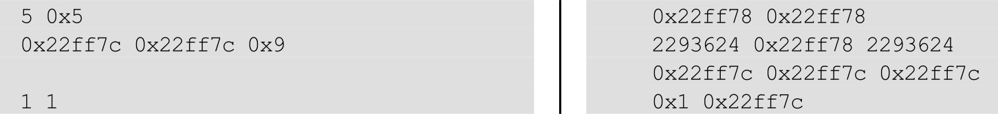 第4步,打印pInt的值,结果是20。再打印pLong的值,发现它变成了65556而不是90 000了。这是因为把90 000赋给*pLong后,它实际存储为5F 90 00 01。把20(也就是十六进制的00 14)赋给指针pInt,因为指针pInt仍然指向相同的地址,因此pLong的前两个字节被覆盖了,变成了00 14 00 01,所以打印的结果变成了65 556。