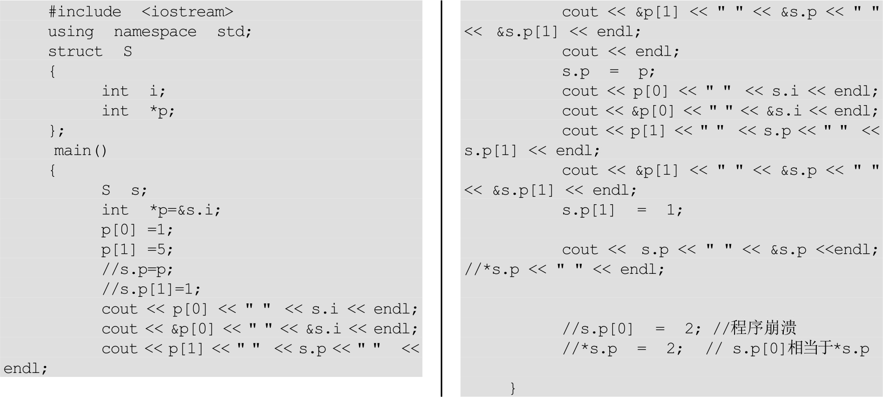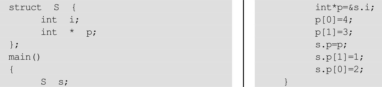 int*p=&s.i;相当于int*p;p=&si;。当执行 p[0]=4;p[1]=3;的时候,p始终等于&si。s.p=p相当于建立了如下关系: