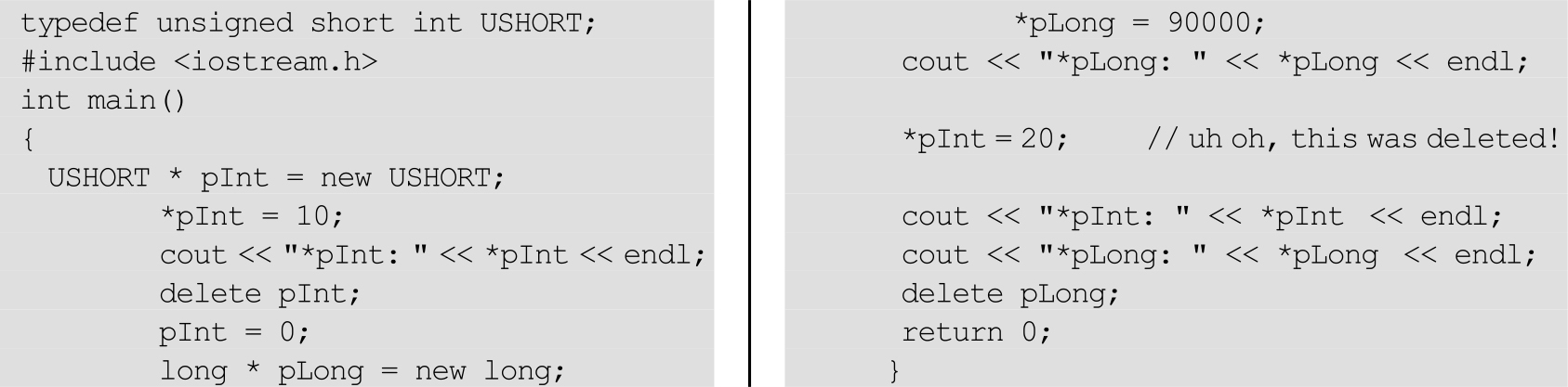 总之,在删除指针后小心不要再使用它。虽然这个指针仍然指向原来的内存区域,但是编译器已经把这块内存区域分配给了其他的数据。再次使用这个指针会导致你的程序崩溃。更糟糕的情况是,程序可能表面上运行得很好,过不了几分钟就崩溃了。这被称为定时炸弹,可不是开玩笑。为了安全起见,在删除一个指针后,把它设置为空指针(0)。这样就可以消除它的危害。