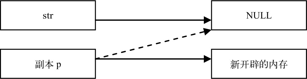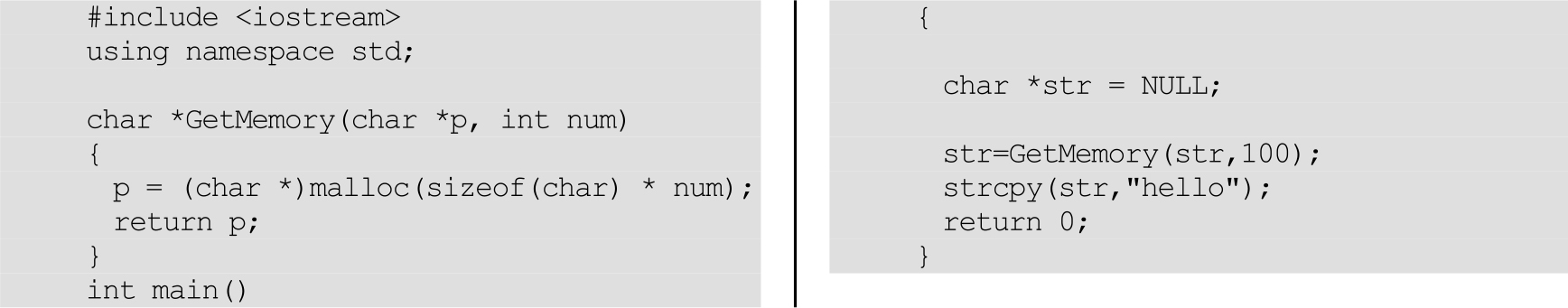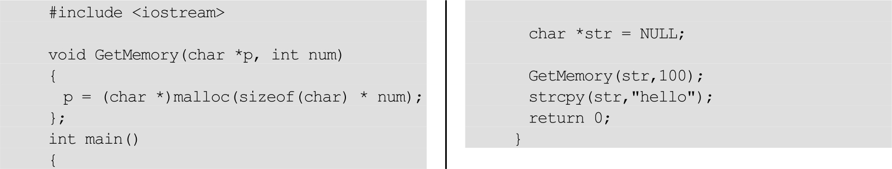 解析 :毛病出在函数GetMemory中。void GetMemory(char*p,int num)中的*p实际上是主函数中str的一个副本,编译器总是要为函数的每个参数制作临时副本。在本例中,p申请了新的内存,只是把p所指的内存地址改变了,但是str丝毫未变。因为函数GetMemory没有返回值,因此str并不指向p所申请的那段内存,所以函数GetMemory并不能输出任何东西,如下图所示。事实上,每执行一次GetMemory就会申请一块内存,但申请的内存却不能有效释放,结果是内存一直被独占,最终造成内存泄漏。