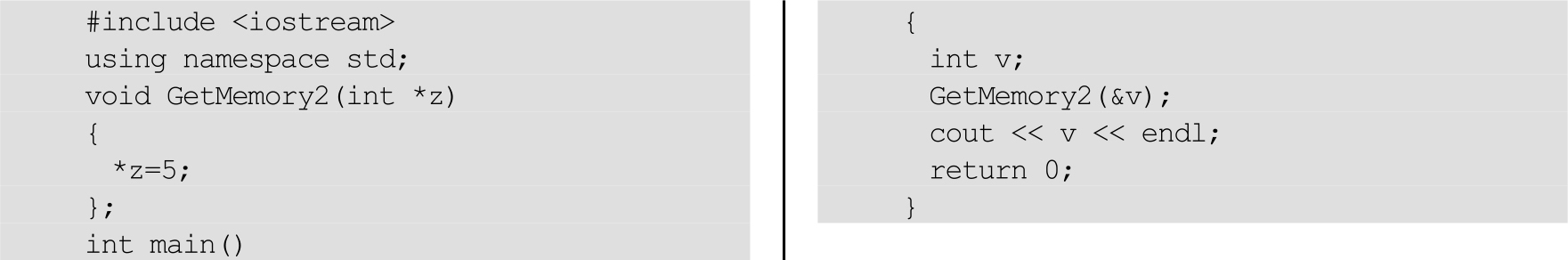 GetMemory2把v的地址传了进来,*z是地址里的值,是v的副本。通过直接修改地址里的值,不需要有返回值,也把v给修改了,因为v所指向地址的值发生了改变。