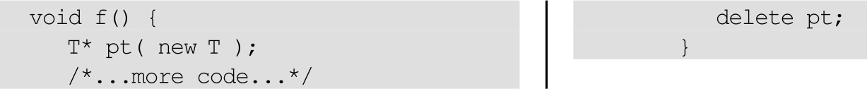 如果f()从没有执行delete语句(因为过早的return或者是在函数体内部抛出了异常),动态分配的对象将没有被delete,一个典型的内存泄漏。使其安全的一个简单方法是用一个“灵巧”的类指针对象包容这个指针,在其析构时自动删除此指针: