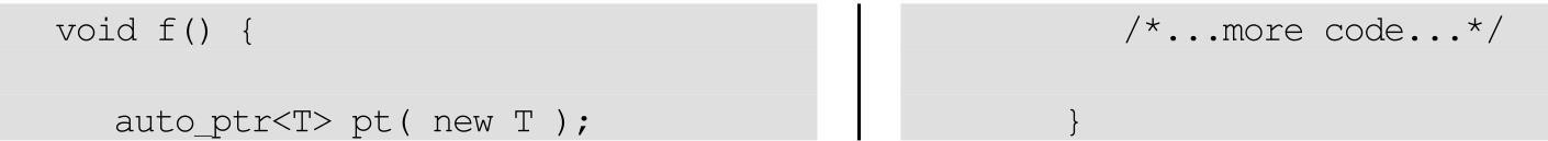 现在,这个代码将不再泄漏T对象,无论是函数正常结束还是因为异常,因为pt的析构函数总在退栈过程中被调用。类似地,auto_ptr可以被用来安全地包容指针: