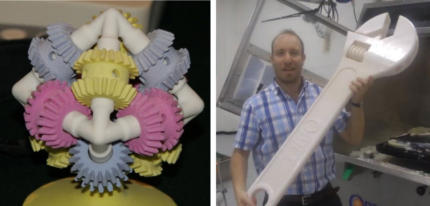 如图1-21左边所示,上大学时有过金工实习经历的读者会很清楚,这堆复杂的齿轮加工起来非常困难,而且它们之间的啮合还是活动的,而不是死的,这就要求特别高的加工精度。传统技术需要你去了解很多知识和技能,如使用数控机床做加工,你需要学习好多年才能成为一名熟练的操作工(实际上,即使你学徒8年也无法加工这个整体一次成型的齿轮组,因为只有3D打印才能做到)。作为对比,3D打印机的操作很快就可以上手,以我们的经验,快的人10分钟,慢的人1小时就可以学会。还有人会说3D打印只能制造一些小玩意,那请看看图1-21右边的这个大扳手!而且这个扳手还是个可调节开口宽度的活扳手哦。齿轮和扳手都是一次成型的,因此都无须任何组装。
