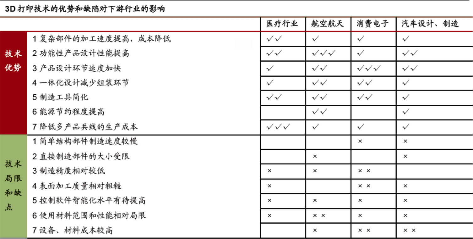 图1-23 3D打印具体应用于各个行业时的优势发挥和局限程度