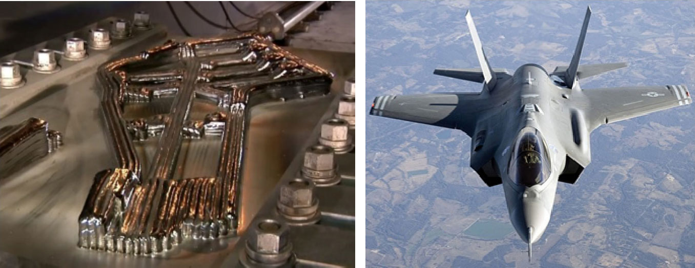美国计划用EBDM来生产第五代隐形战斗机F35的多个零件,现在已经开始在做各种苛刻的检测。假设F35将生产3,000架,采用EBDM技术仅副翼这一个零件就能节省1亿英镑。很多钛合金零件都有希望采用EBDM技术,这项技术将是在不牺牲质量的情况下降低成本的关键。目前EBDM技术可以直接生产的金属包括钛、钽、铟镍合金等,能打印的最大尺寸为19英尺×4英尺×4英尺(约5.7m×1.2m×1.2m)。去年Sciaky公司总共生产了1万多斤金属,其客户包括美国国防部、空军、洛克希勒、波音等。EBDM的打印案例如图2-28所示。