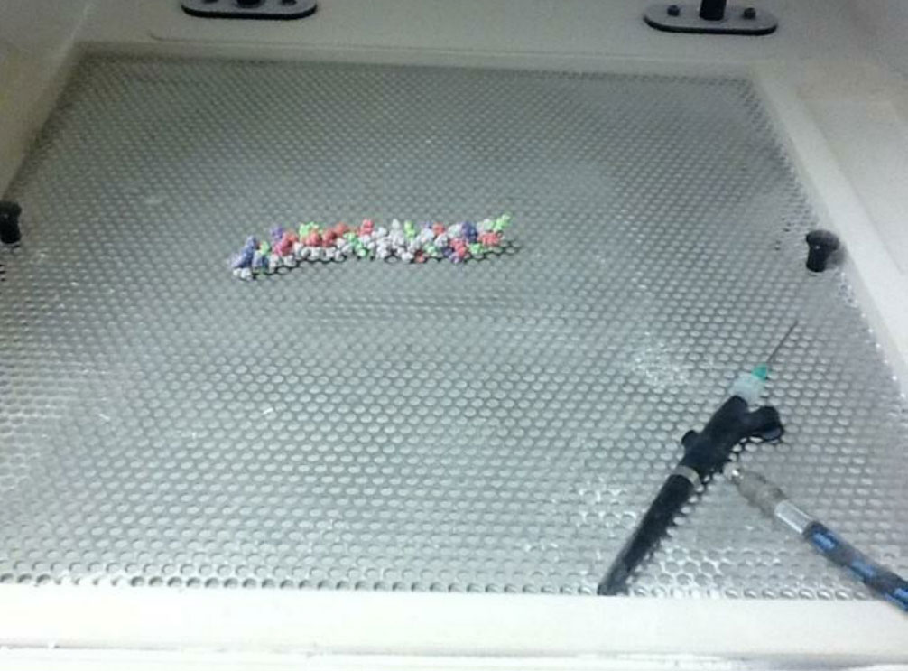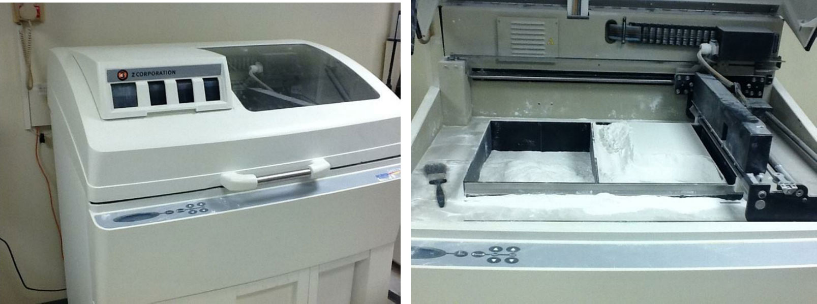 我们采用的是Zprinter系列打印机,使用3DP工艺。原理和喷墨打印机一样。上一层粉,喷一层该截面形状的胶水,再继续上粉。可以选择透明和彩色两种胶水。