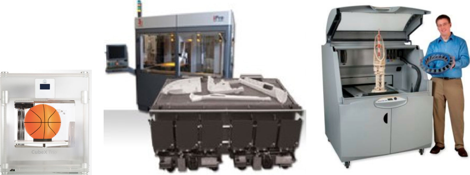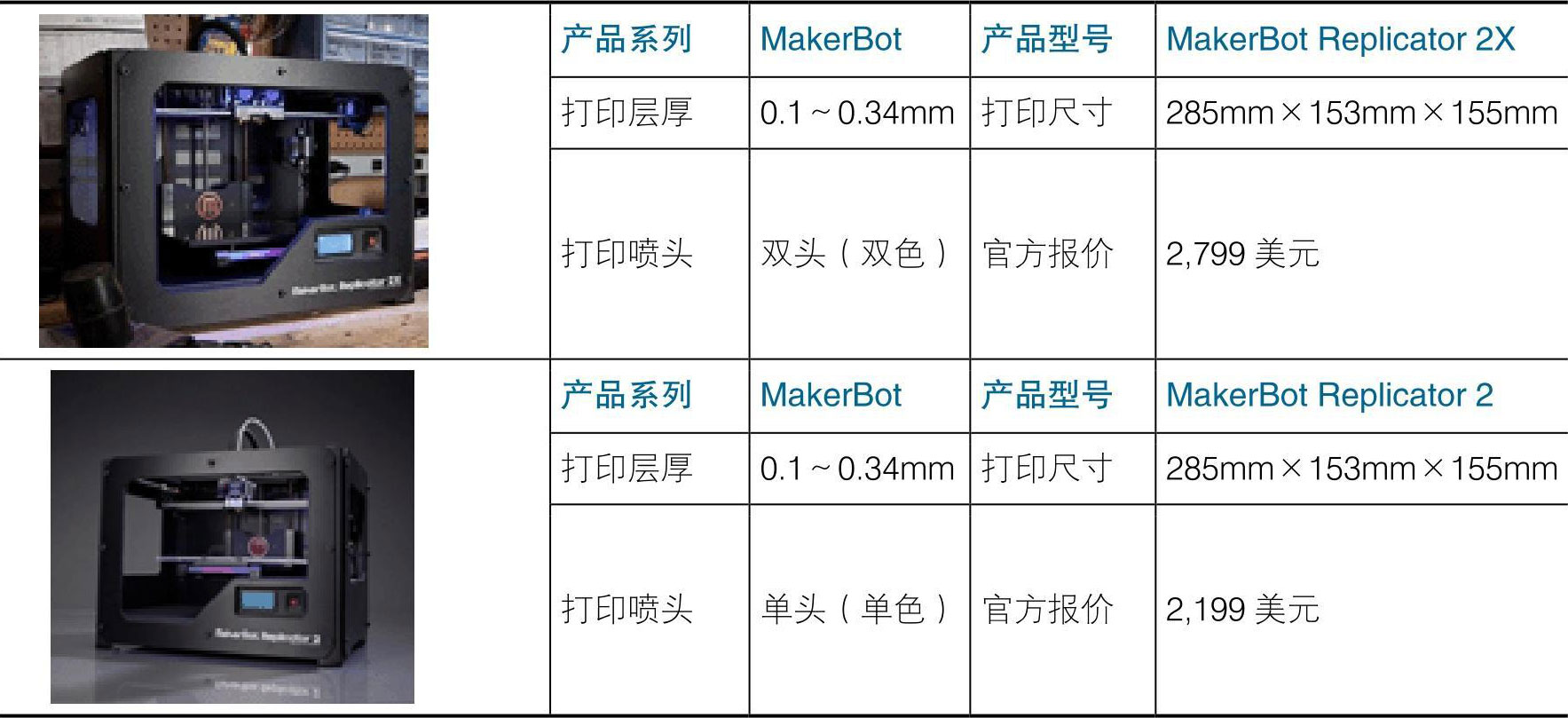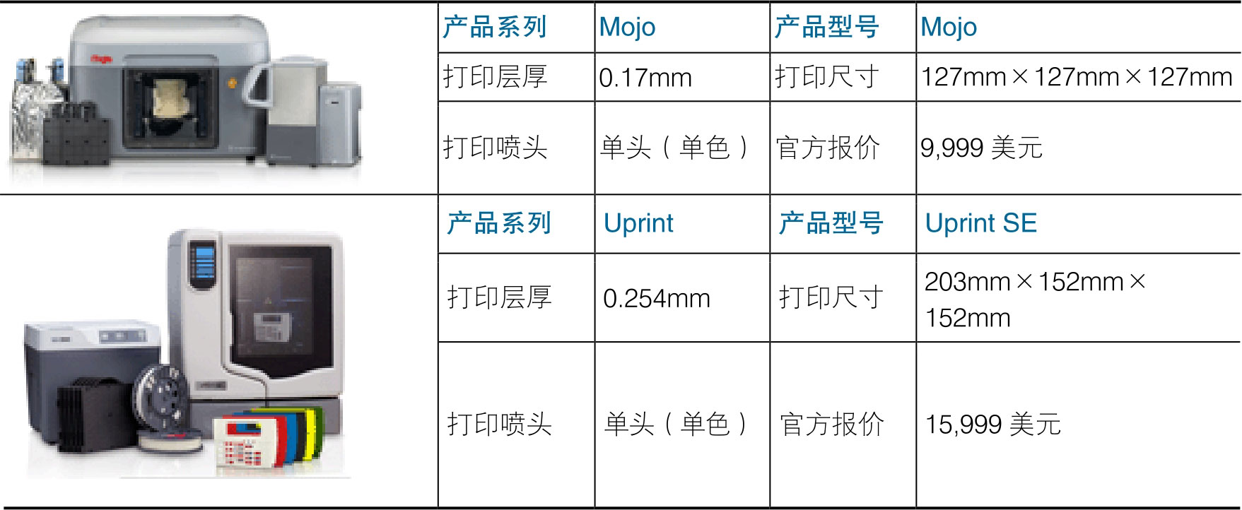 与此同时,Stratasys也在克伦普的带领下快速成长,于1992年推出了第一台基于熔融沉积成型的3D打印机──“3D造型者(3D Modeler)”。公司于1994年在纳斯达克上市,并先后推出了多款面向不同行业和市场的3D打印机,如图2-30所示。根据Wohlers 2012年的报告,2011年Stratasys公司占有增材制造市场41.5%的市场份额,连续10年成为市场领头羊。