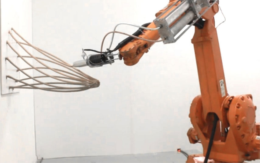 最后再介绍一款奇特的3D打印机。一般情况下,3D打印机需要放到一个水平的地方再进行作业。而一款名叫“Mataerial”的3D打印机器人打破了这种局限,它完全可以在垂直、光滑,甚至凹凸不平的表面打印产品,不需要任何支撑工具。机器使用热固性聚合物取代一般3D打印机常用的热塑性塑料,从喷头挤出来的材料能够瞬间凝固,并随着机械臂的摆动而调整出各种形状,如图2-42所示。