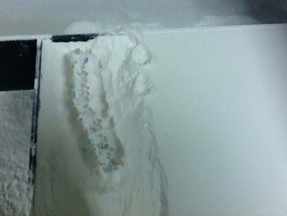 打印前,先将右槽的粉铲入左槽,慢慢降低左槽(同时升高右槽),再抹平表面。打印时左边槽升高、右边槽降低,一边把粉一层一层吹过去,一边上胶。打印的时间取决于产品体积大小。图2-35是打印完毕后用铲子挖开周边的样子。刚打印出来的产品很脆,很容易损坏。