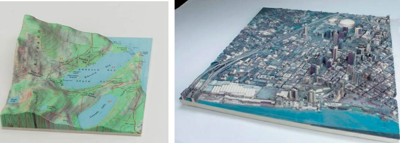 而使用3D打印技术,可在项目早期阶段就通过数字化3D设计让客户预览到最终的效果,可增强设计者与客户之间的交流。3D打印可生成具有复杂内嵌细节的建筑结构,也可制作出任意比例的模型。全彩色打印会给客户留下更深刻的印象并更有说服力。而且,因为有了数字化设计版本,所以可以简单、快速、低花费地复制相同的模型。模型可在设计的任何阶段打印输出,直接应用到城市规划布局上,如图2-44所示。