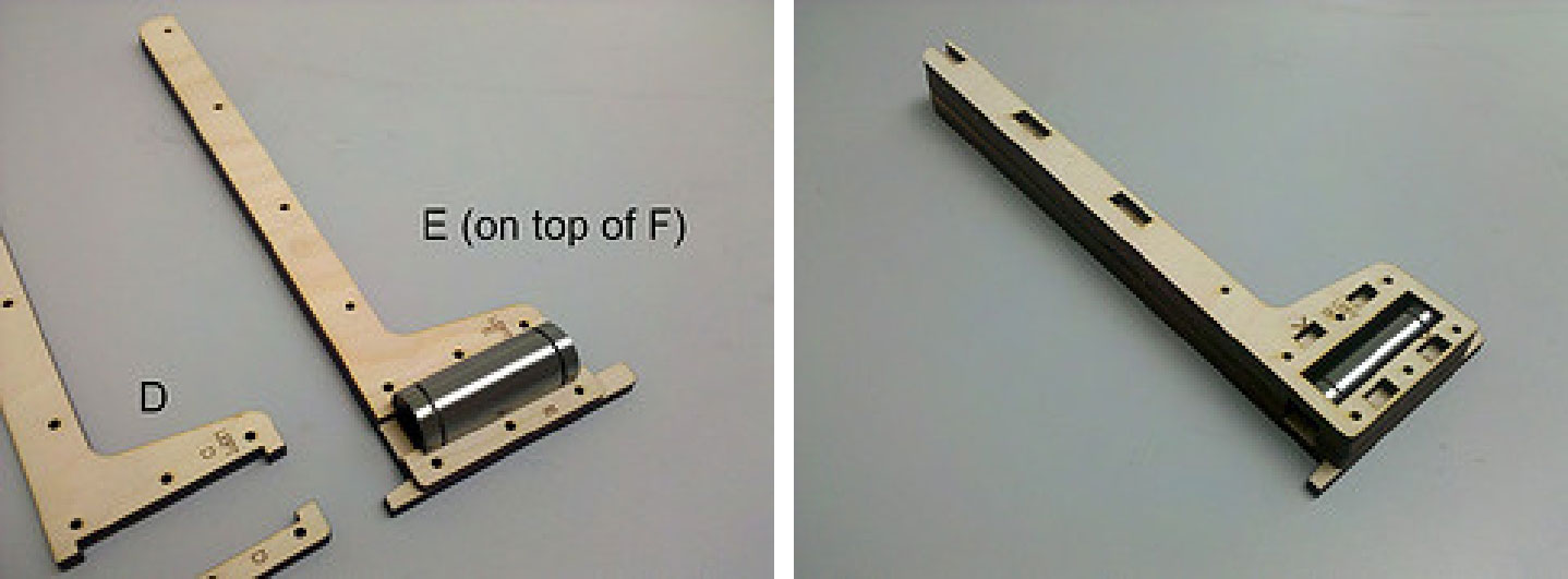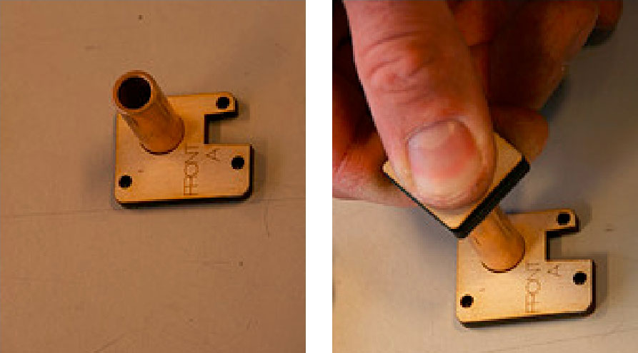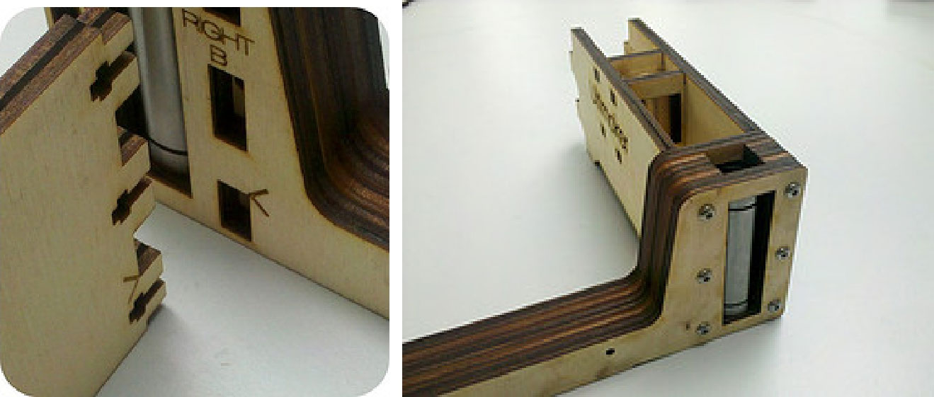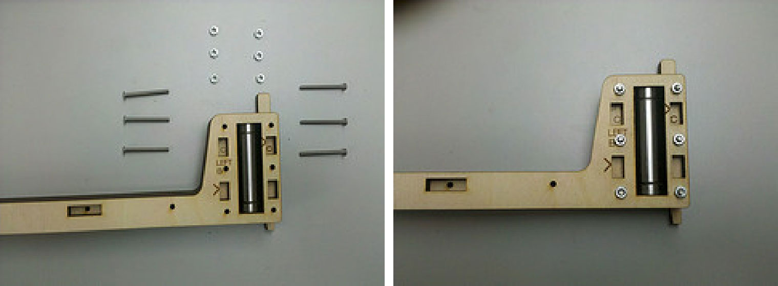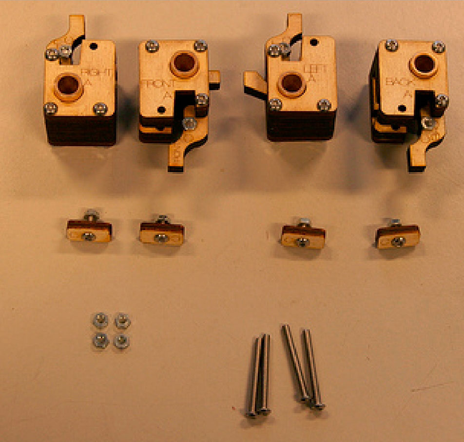 2.现在拿出标有FRONT、BACK、LEFT和RIGHT的4块木片。拿出RIGHT木片放在轴承的一边,另一边是LEFT木片。拿起FRONT木片放在LEFT和RIGHT木片之间,如图3-32所示。保持刻字的一边朝外。然后拿出BACK木片放在FRONT木片对面,这样外壳就做好了。用M3 10mm螺钉和T形槽拧紧外壳。