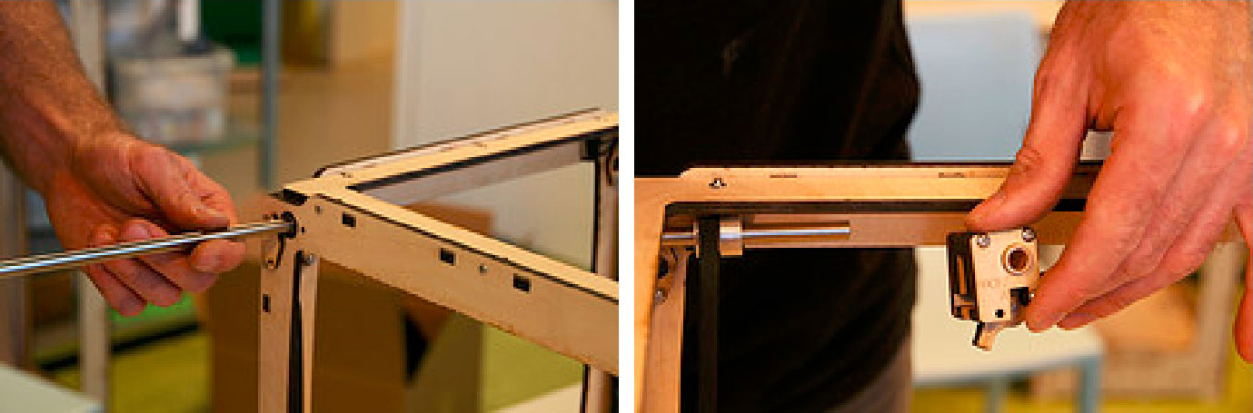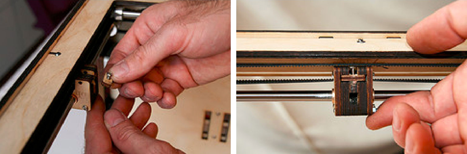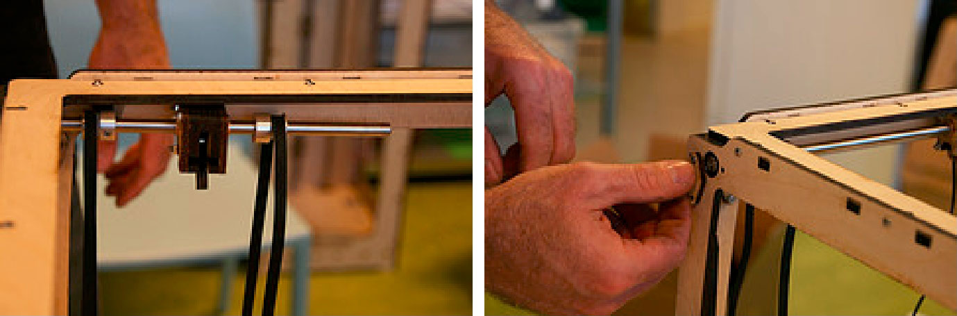 4.另外一根同步带放在同步轮上,然后把轴的另外一端插入面板上的球轴承。旋转轴承帽,并用螺栓固定,用螺帽拧紧,如图3-28所示。