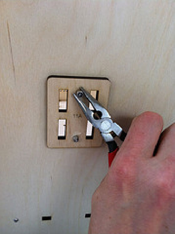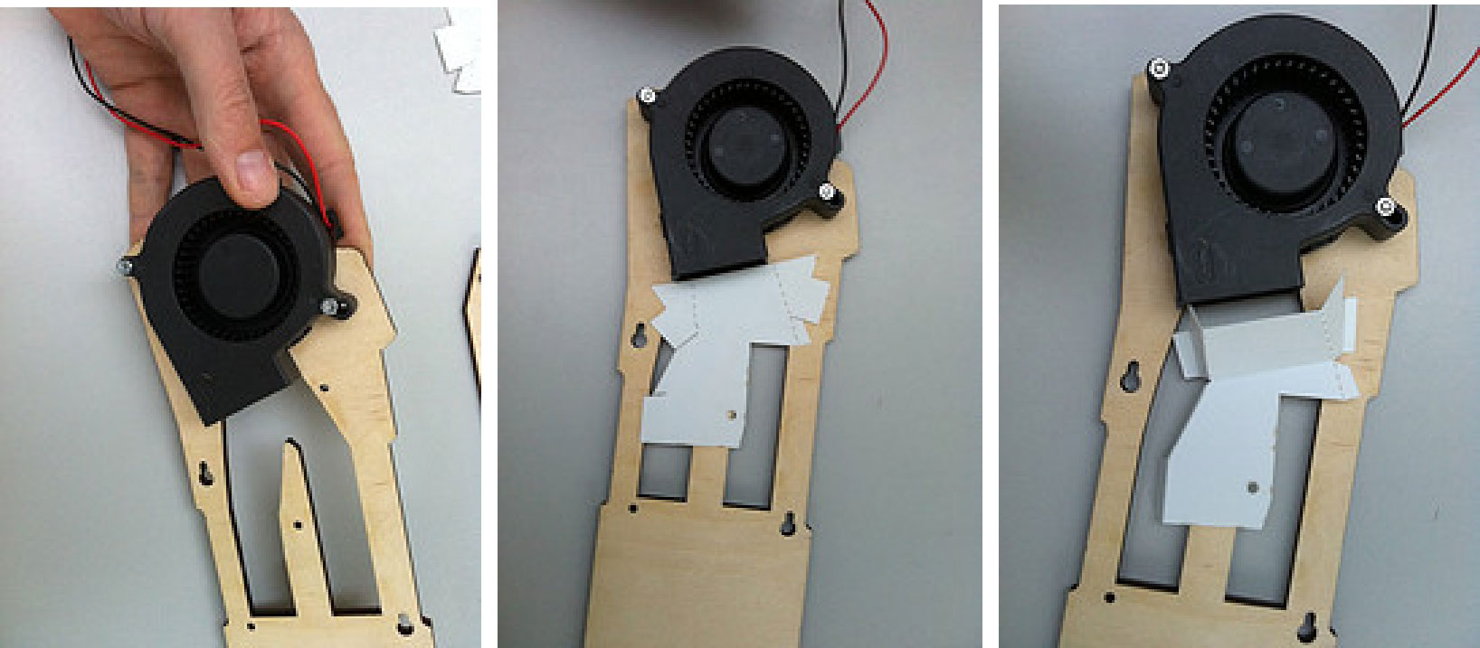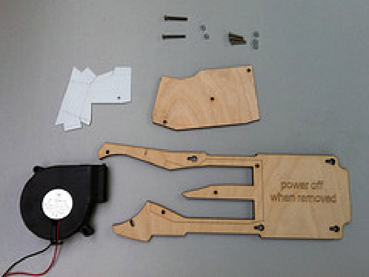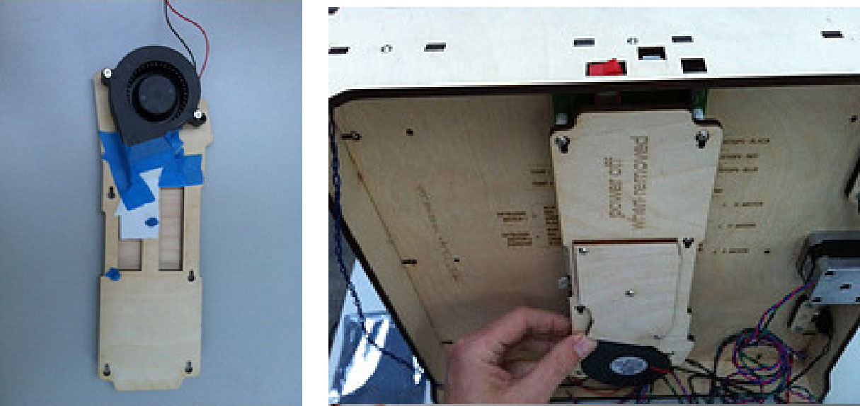2.在带标记侧,把木质的空气导板覆盖在开口上面,并用5个螺栓(12mm)拧紧。注意要使用短螺栓,这样不会碰到电子器件。然后,将蓝色绝缘胶带贴在螺栓末端以确保它们不会导电。