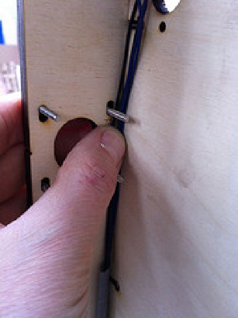 1.握住驱动螺栓,把树脂夹子按入凹槽,如图3-61所示。将其从电机的一端推入轴承,伸到另一端。GOOD柄部分(接近下面)应该位于两块板材之间。如果不是,检查一下螺栓是否安装牢固,但也不要太紧。