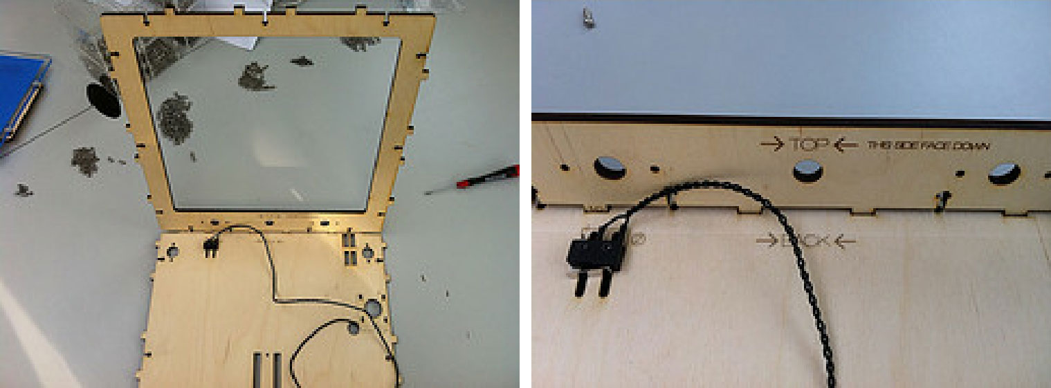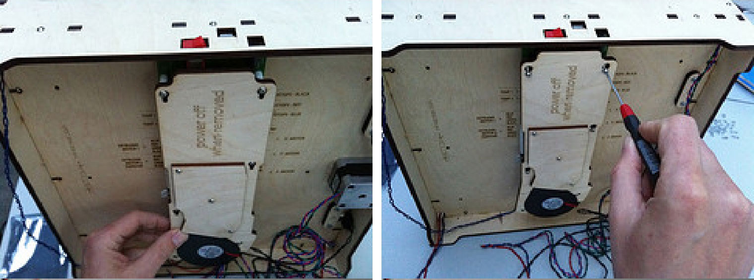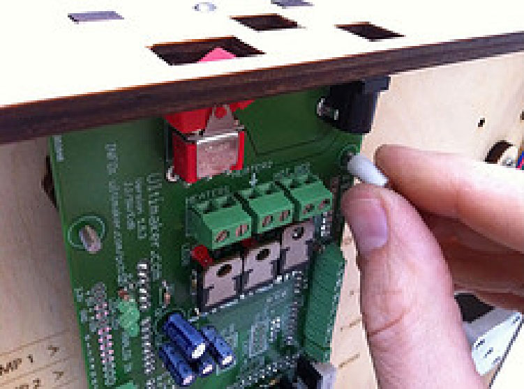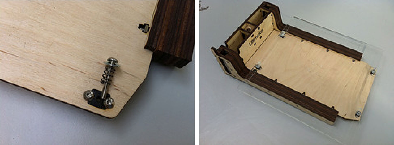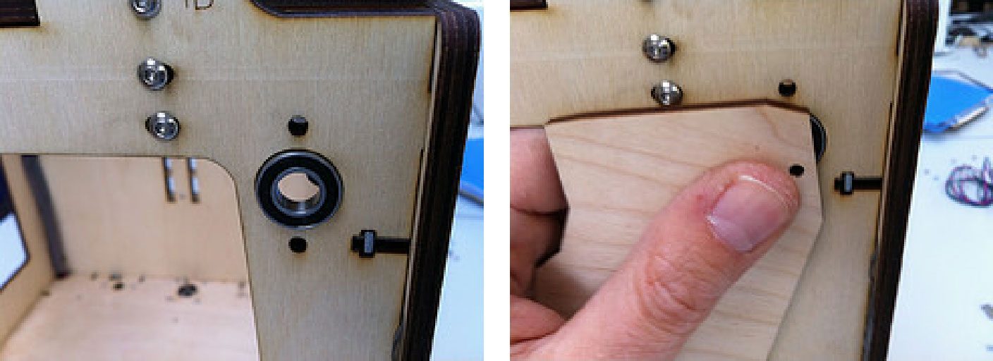 3.在后面板的背面上,安装2个黑色的限位开关,彼此相对且弹片都朝左。在底部面板使用12mm的M3螺栓。对于后面板上方的限位开关,在螺杆头部和木材之间使用2个垫片,以便最后再做细小的调整。