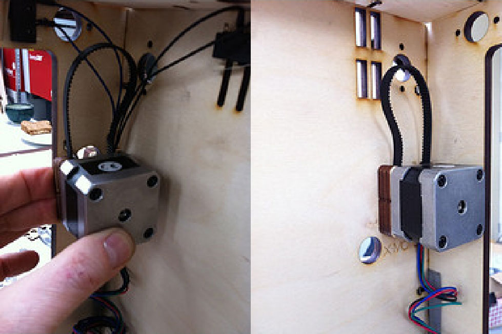 3.稍微拧紧电机的4个螺栓,方便往上和往下滑动。等所有轴安装好后,再将这些螺栓拧紧,如图3-18所示。 Y 轴电机类似,并安装到左面板。在你安装 Y 轴电机前,确保将电缆归拢到角落。