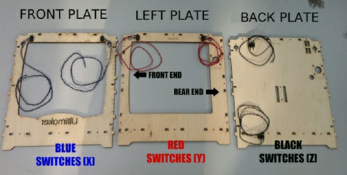 1.在前面板的背面上,使用2个M3螺栓(10mm)安装2个蓝色的限位开关,控制弹片朝上。