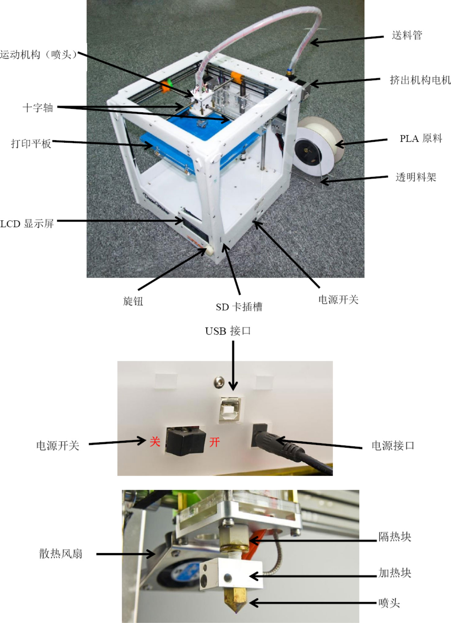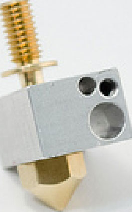 喷嘴主要分为两种:J-head和Budaschnozzle。J-head重量较轻,适合用在精度要求较高,或者机械轴负载能力较弱的结构中,比如三角爪式结构。Budaschnozzle喷头有主动散热和被动散热两种方式,比如MakerBot、RepRapPro上的MK7喷头便采用主动式散热。