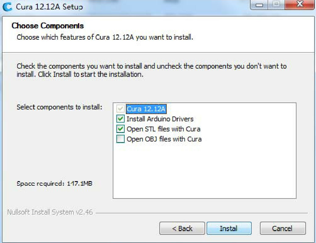 双击Cura安装程序进行安装,选择安装位置。注意:目录名及文件名均为英文字符,因为该软件暂不支持中文字符;然后,选择需要安装的组件,如图3-75所示,如果你希望还可使用OBJ格式文件,请选中“Open OBJ files with Cura”复选框。
