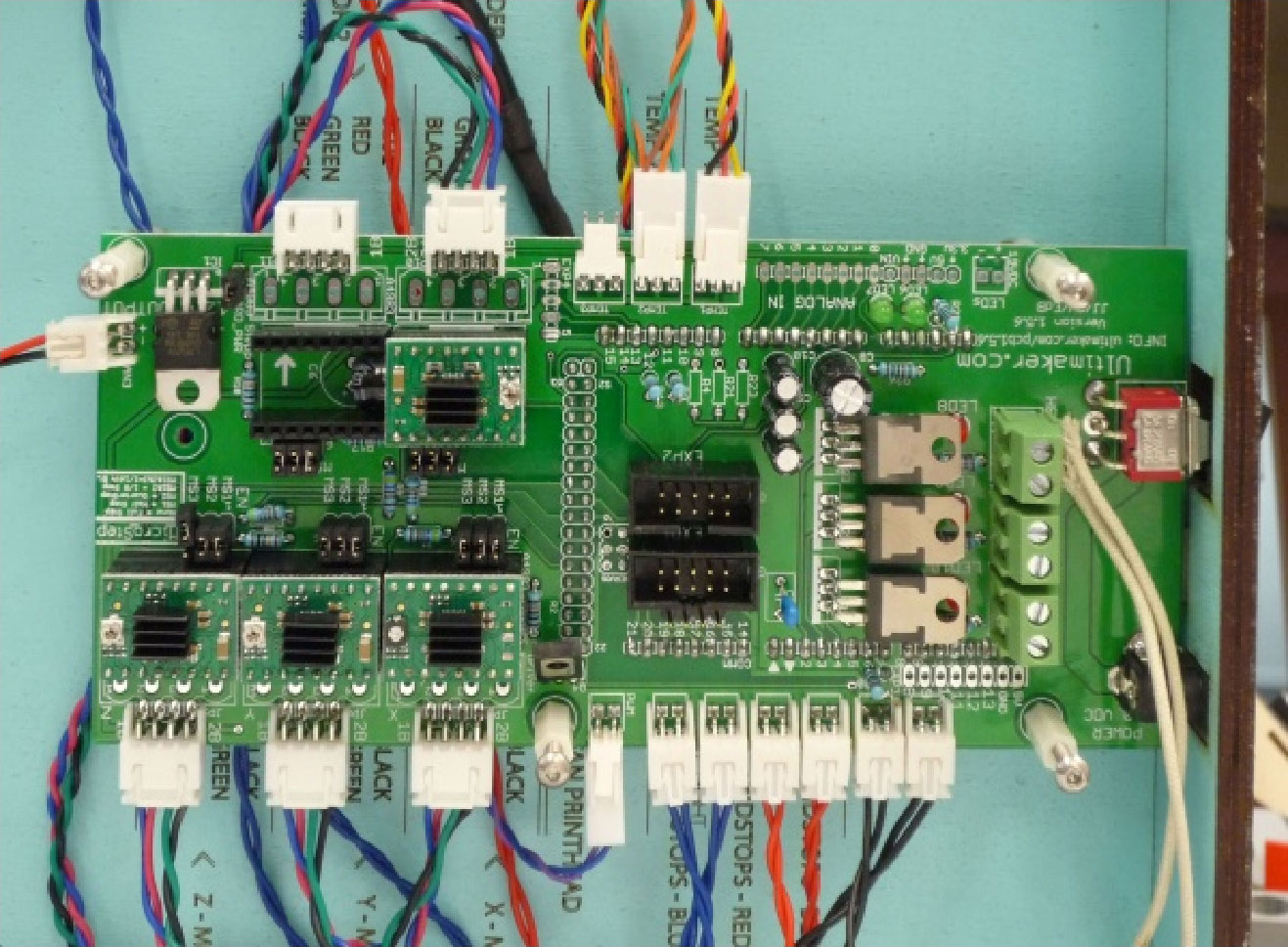 其次,在控制电路板部分,要么采用 Arduino Mega开源集成套件 (主要代表有 RAMPS, RepRap Arduino Mega Pololu Shield, Ultimaker Electronics ),要么 直接用AMTEL ATMEGA644P、ATMEGA1284等芯片 将单片机和控制电路做在一起(主要代表有Sanguinololu、Printrboard、Melzi、GEN 6、GEN 7)。前者很方便扩展,但因为集成了很多资源接口,所以初次投入成本稍高,体积也稍大一些。后者体积较小、初始成本稍低,但因为不是集成套件,所以后期维护比较困难。