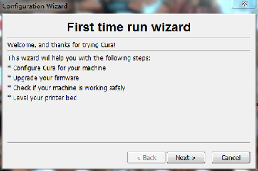 第一次打开Cura会提示进行调试,如升级固件、检查打印机是否安全运行、将平台调整到水平等,如图3-77所示。如果你不想调试,单击“Cancel”按钮取消调试,则直接进入到使用界面。Cura的初始界面如图3-78所示,在这个界面中你可以简单地选择“打印质量(Select a print type)”、“打印耗材(Material)”和“是否打印支撑(Other:Print support structure)”,在右侧界面中我们可以预览打印后的模型。