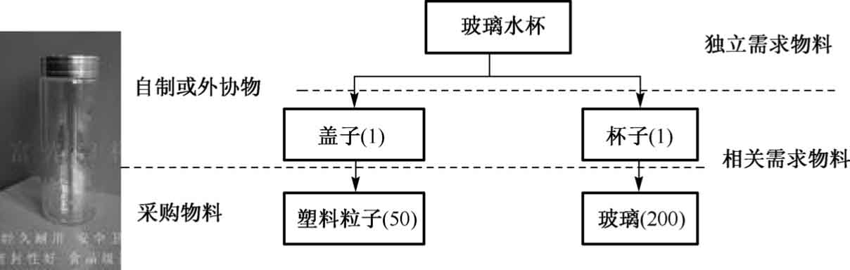 例如,一个玻璃水杯由盖子和杯子组成,盖子使用50克塑料粒子制成,杯子使用200克玻璃制成,则玻璃水杯的物料清单(BOM)如图3-2所示。
