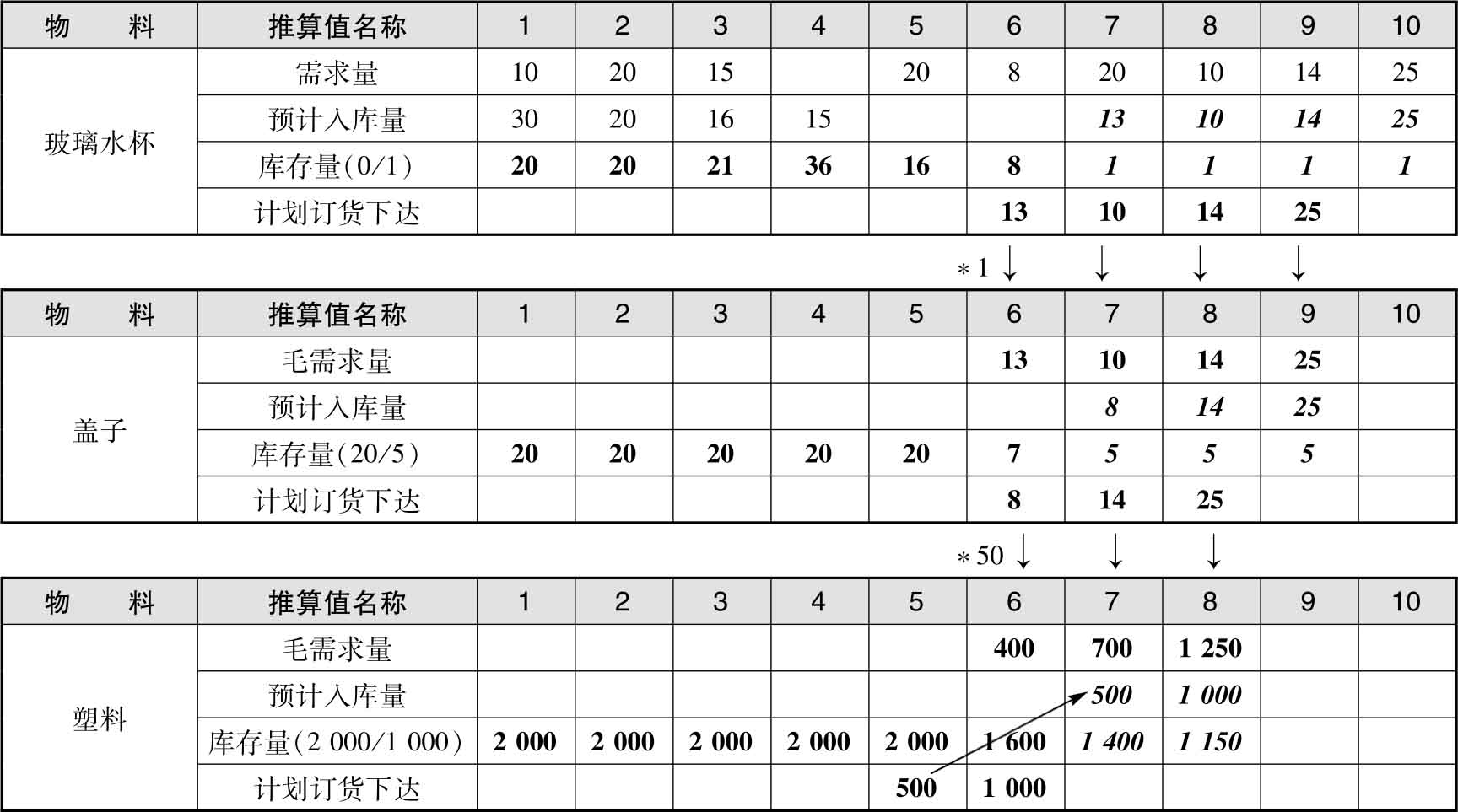 对盖子与塑料粒子的物料需求计划的展开,请读者按MRP原理尝试推算。读者也可以对简单的日常用品,如钢笔、铅笔、眼镜等拆分,构建相关产品的物料清单和假设相关的物料主文件数据。反复演练。