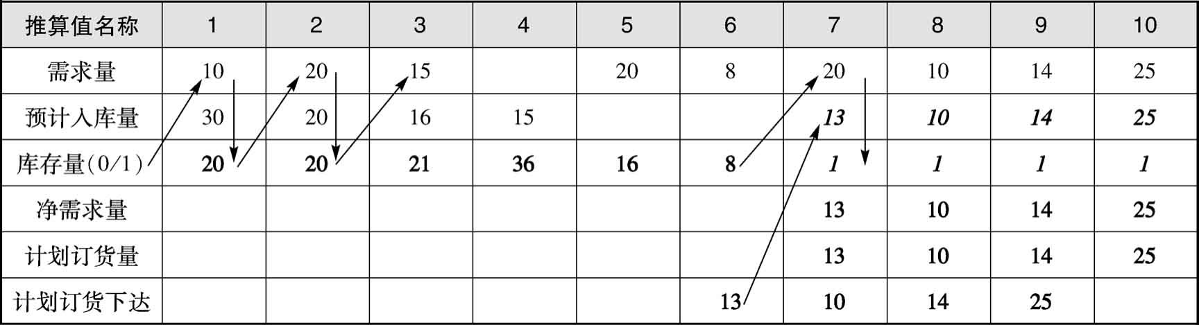 依次计算出各时区的库存量。当库存量出现负值或低于安全库存量时,将产生净需求。第一次净需求是在第7时区,库存量将少于安全库存量。净需求的计算方法见②。