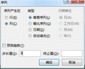 (2)在“序列产生在”选项组中选择想要让填充的数据填充初始单元格的同行还是同列;在“类型”选项组中选择数据填充的方式,其中可以选择的数据填充方式有等差序列、等比序列、日期、自动填充四项,填充日期时,还需要在对话框右侧选择日期单位;在“步长值”文本框中输入序列中相邻两项的差或比值(若填充类型为等差序列,则“步长值”表示序列中相邻两项的差;若填充类型为等比序列,则“步长值”表示序列中相邻两项的比值);在“终止值”文本框中输入想要填充到的最终数值,单击“确定”按钮即可。