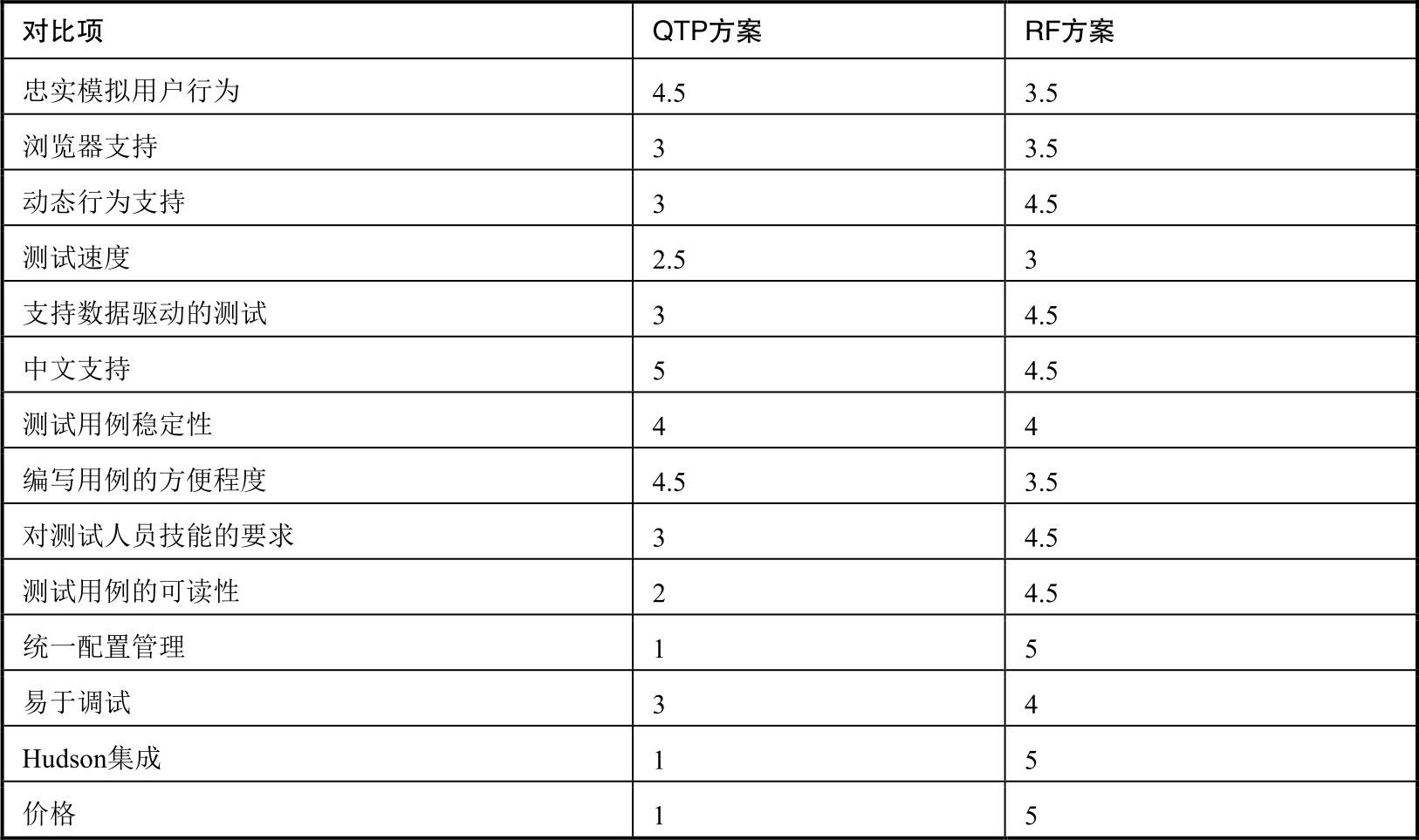 简单对比一下QTP和RF。这是吴穹博士在推荐我们放弃QTP、采用Robot Framework的时候做的一个比较表,表内每项满分为5分,分数范围1~5。总体来说,RF方案是占优的,见表1-2-1。