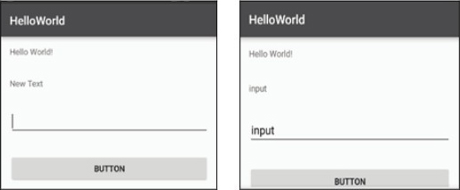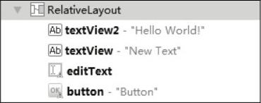 【例2-4】 在布局文件activity_main.xml 中添加3个控件:一个控件是编辑框EditText,用户可以输入信息;一个控件是文本框 TextView,用于显示信息;一个控件是 Button,用户单击Button 时,可以将编辑框输入的信息显示在TextView 中。实现步骤如下: