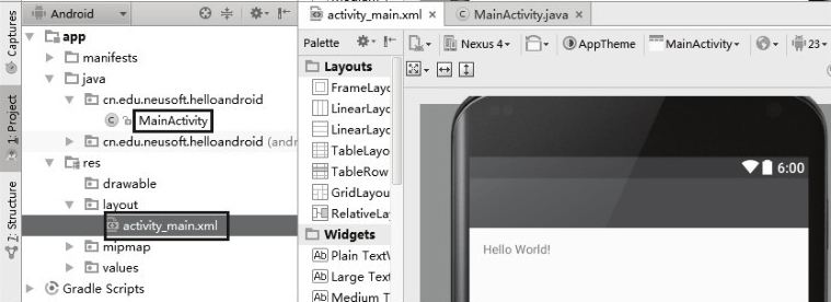 新创建应用程序时,默认在/res/layout目录下创建了布局文件 activity_main.xml。并且同时在java源代码目录下,默认创建了MainActivity类,工程结构如图2-18所示。