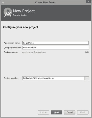 (1)创建新项目:项目名称LoginDemo,公司域名neusoft.edu.cn,如图4-6所示。Activity的配置如图4-7所示。