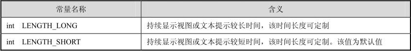 Toast中有两个关于Toast显示时间长短的常量,如表4-3所示。