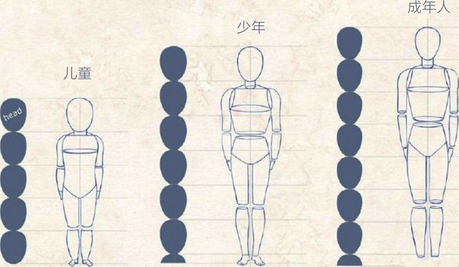 我们在画人物时,经常能听到几头身的说法。其实头身比就是身高与头部的比例,几头身指的是身高为头高的几倍。一般来说,儿童是5头身,少年是6.5头身,成年人是7.5头身。