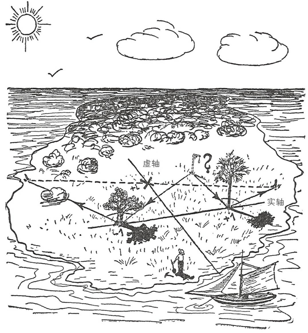 所以,如果我们年轻的冒险家当时若做一点这样简单的数学计算,他就不需要挖遍整个荒岛,而大可直接去图5画×的点上挖掘宝藏,并且一定能在那里找到宝藏。