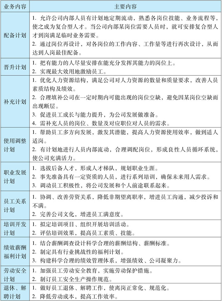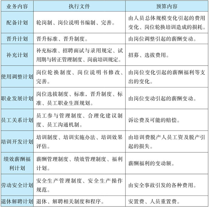 2. 人力资源规划各项业务计划执行文件及预算内容如下表所示。