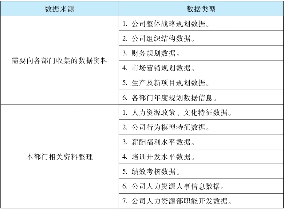 1. 公司经营发展目标、战略规划、经营环境分析。公司人力资源部正是制定人力资源规划前,必须向各职能部门索要各类数据,人力资源部负责从以上数据中提炼出所有与人力资源规划有关的数据信息,并且整理编报,为有效地规划人力资源提供基本数据。具体如下表所示: